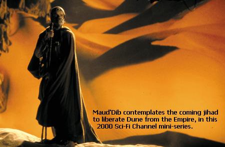 Oh yes, Dune has all the parallels. The hero even uses the J-word -- jihad. Of course, critics have long recognized that Dune was inspired by Islam, and that Herbert modeled Maud'Dib on Mohammed. But I've yet to hear someone note the parallels post-9/11.