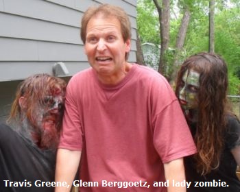 Midget Zombie Takeover was shot for $2,000 -- in the house Berggoetz was living in (a rental). "It worked out great because I didn't have the money to put the cast and crew up in a hotel. Everyone stayed at the house -- it was like summer camp! When filming was done for the day (usually around 11 pm) I would head to my bedroom, and try to get six hours of sleep before starting again next day. Most of the cast and crew was staying up until three or four in the morning, talking and carrying on. I'd get up at five to get ready for that day's shoot to find that most of the cast and crew had just gone to bed. When we'd start shooting again around eight in the morning, there were a lot of tired people on set."