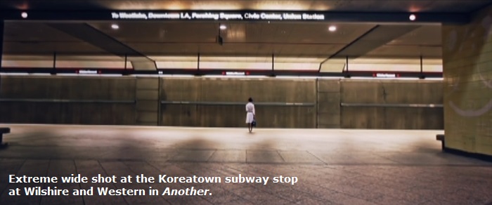 Most film fans are familiar with New York City's subway system, but how many will recognize the above station in Los Angeles? (How many Angelinos even know we have a subway?) I thought the station was in Europe, but it's in L.A.'s Koreatown. It's one of Another's many eerily composed shots. The extreme wide frame and lonely staging highlights Jordyn's vulnerability. It's a shot that evokes a similar extreme wide frame in Dario Argento's Inferno (below).