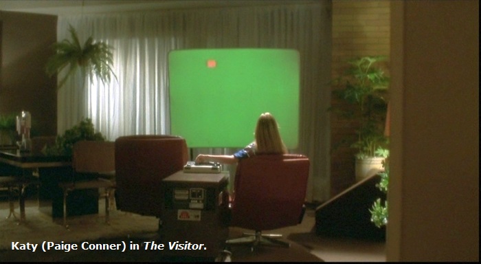 Adding to the creepiness of Jordyn's encounter with her boyfriend is the sound of the video game's monotonous, electronic ponging. There's something about that sound. Director Giulio Paradisi used that sound to similar effect in his 1979 Italian film, The Visitor. Actress Joanne Nail arrives to what she thought was her empty home, only to be greeted by a sound of ponging. She warily searches through her house, finding her devil daughter (above) playing a pong-like video game in the living room. (Does anyone still remember projection TV screens?)